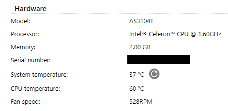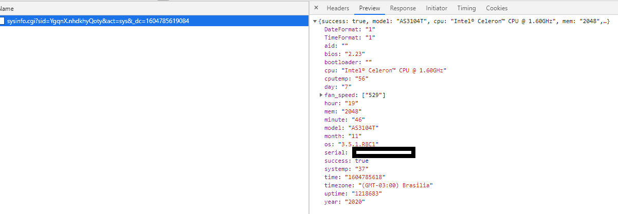 { "success": true,"model":"AS3104T", "cpu":"Intel® Celeron™ CPU @ 1.60GHz", "mem":"2048", "serial":"XXX", "os":"3.5.1.R8C1", "timezone":"(GMT-03:00) Brasilia", "time":"1604786559", "year":"2020", "month":"11", "day":"7", "hour":"20", "minute":"2", "DateFormat":"1", "TimeFormat":"1", "uptime":"1219624", "cputemp":"56", "bios":"2.23", "bootloader":"", "fan_speed": ["528"], "systemp":"37","aid":""}