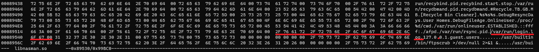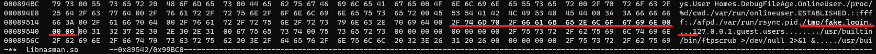 Ok, let’s take a different approach. How about cracking the session? The NAS is x86-x64, so we could modify the binary to not check the token and just return the information we want. Or maybe we could just modify which file it reads to something we can control: this would be way easier and faster. The tracing did indeed show it was reading the login.log file: