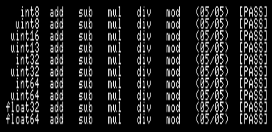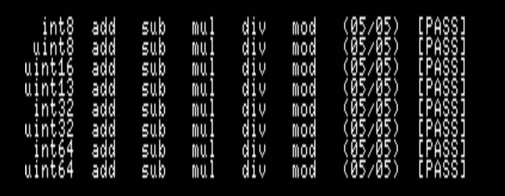 - 8/16/32/64-bit integers (signed and unsigned) for addition, subtraction, multiplication, division and remainder operations