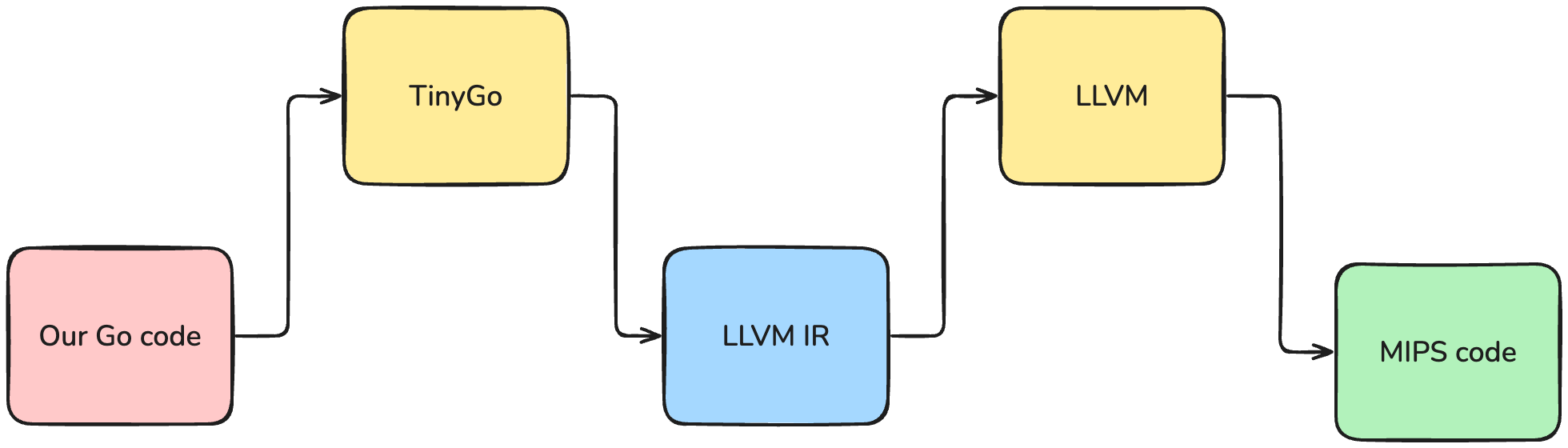 Right now we’re hacking things on the TinyGo section, generating a valid LLVM IR code for our platform. We want to move our hacks into the LLVM part instead, so that TinyGo has as little modifications as possible and LLVM has to deal with our weird, quirky CPU. Easy, right?