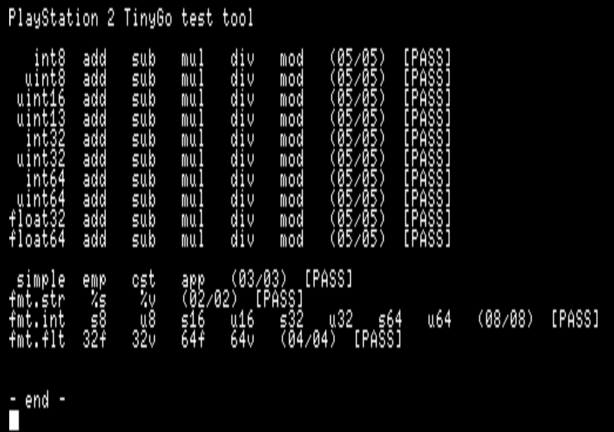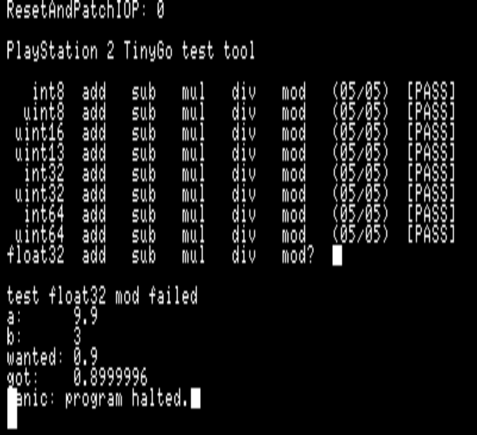 Note that we didn’t change any addition or subtraction: those instructions are supported by the PS2. Only multiplication and division are not. Weird. Anyway, now we can restore TinyGo’s original code for handling these operations to its former glory and not have to worry about this anymore (hopefully).