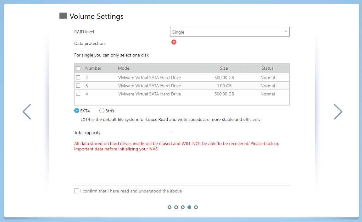 The installation process is very simple. There’s a wizard which will help you through the process, making a few simple questions. There’s a custom mode that will allow you to define the RAID level and everything. Ah, and obviously now it see the disks, as the model it thinks it is actually has SATA ports. Hehe.